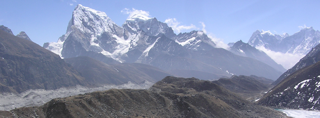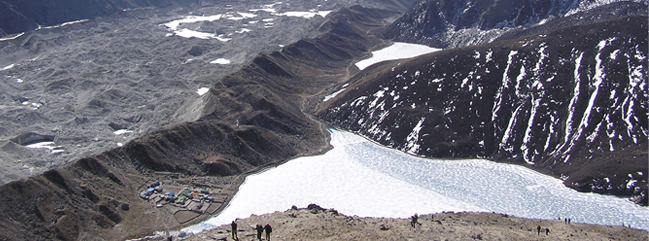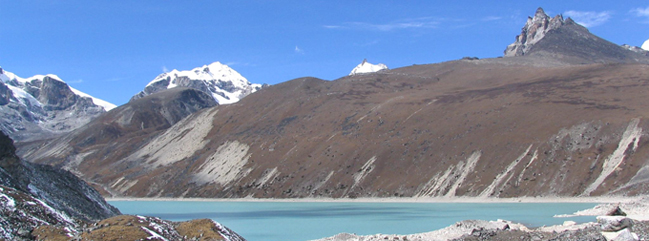 From Machhermo to Gokyo the trail climbs a ridge for an excellent view both down valley to Kangtega and up towards to Cho-Oyu (8153m). Beyond the ridge, the valley widens as the trail passes through Pangka at 4390m then descends to the river bank before beginning the climb onto the terminal moraine of the Ngozumpa glacier. It is a steep climb up the moraine, switch backing alongside the stream to the first small lake at 4650m where a family of Brahmin ducks has resided for many years. The trail now becomes almost level as it follows the valley past a second lake known as Longponga. We finally reach Gokyo on a boulder-strewn path at 4750m. It takes about 4 to 5 hours. Overnight at Teahouse